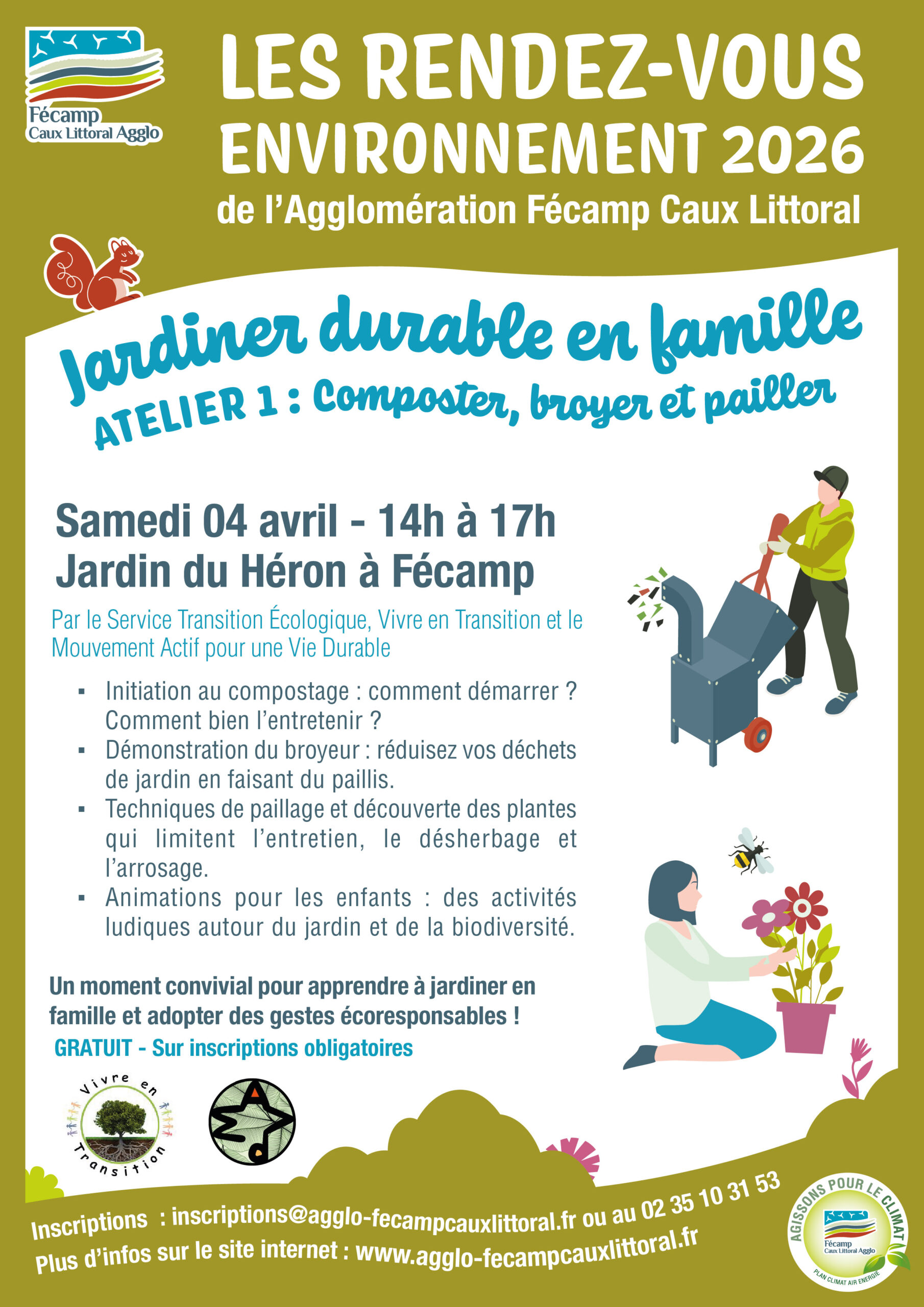 Dans le cadre de ses Rendez-vous Environnement et à l’occasion de la Quinzaine du compostage, l’Agglomération Fécamp Caux Littoral vous propose deux après-midis d’animations autour du jardinage durable. Ils auront lieu au Jardin du Héron, route de Valmont à Fécamp. Pensez à vous inscrire !