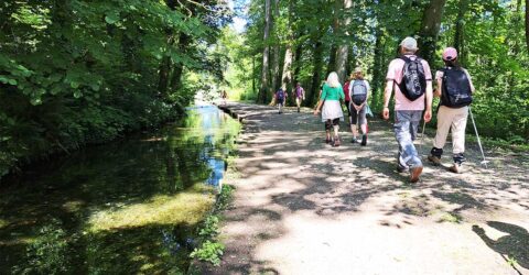 Un petit groupe de randonneurs se balade le long d'une rivière dans un sous-bois.